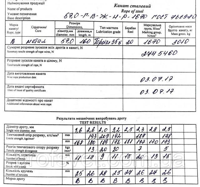 Канат сталевий 57,0-Г-В-Ж-Н-Р-1670 ГОСТ 7669-80.